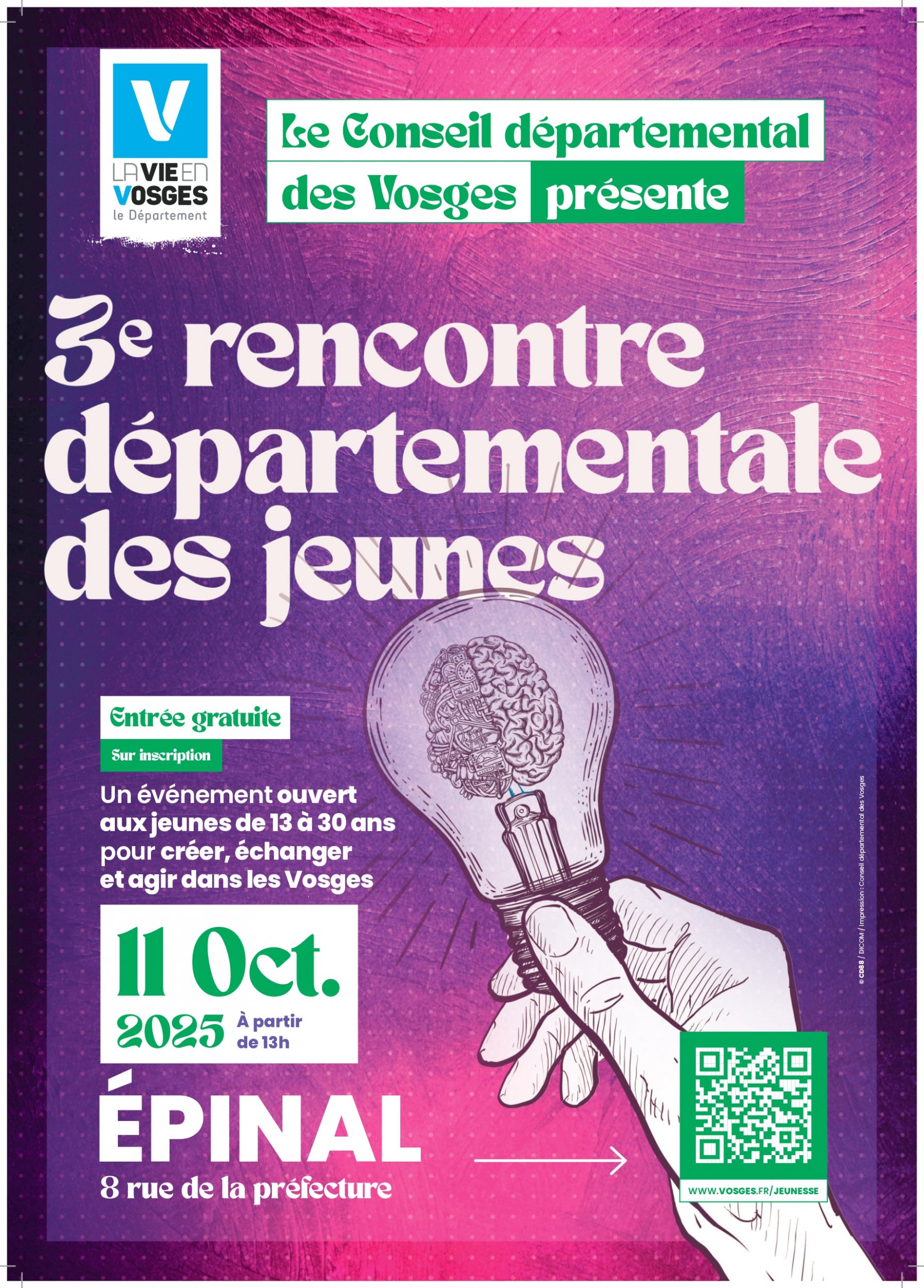 Nous vous informons que le Conseil départemental des Vosges organise la 3e rencontre départementale des jeunes le samedi 11 octobre à Epinal.