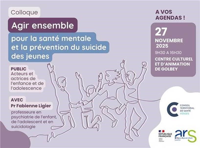 La commission spécialisée en santé mentale du Conseil territorial de santé des Vosges a le plaisir de vous inviter à son colloque intitulé « Agir ensemble pour la prévention du suicide des jeunes ».