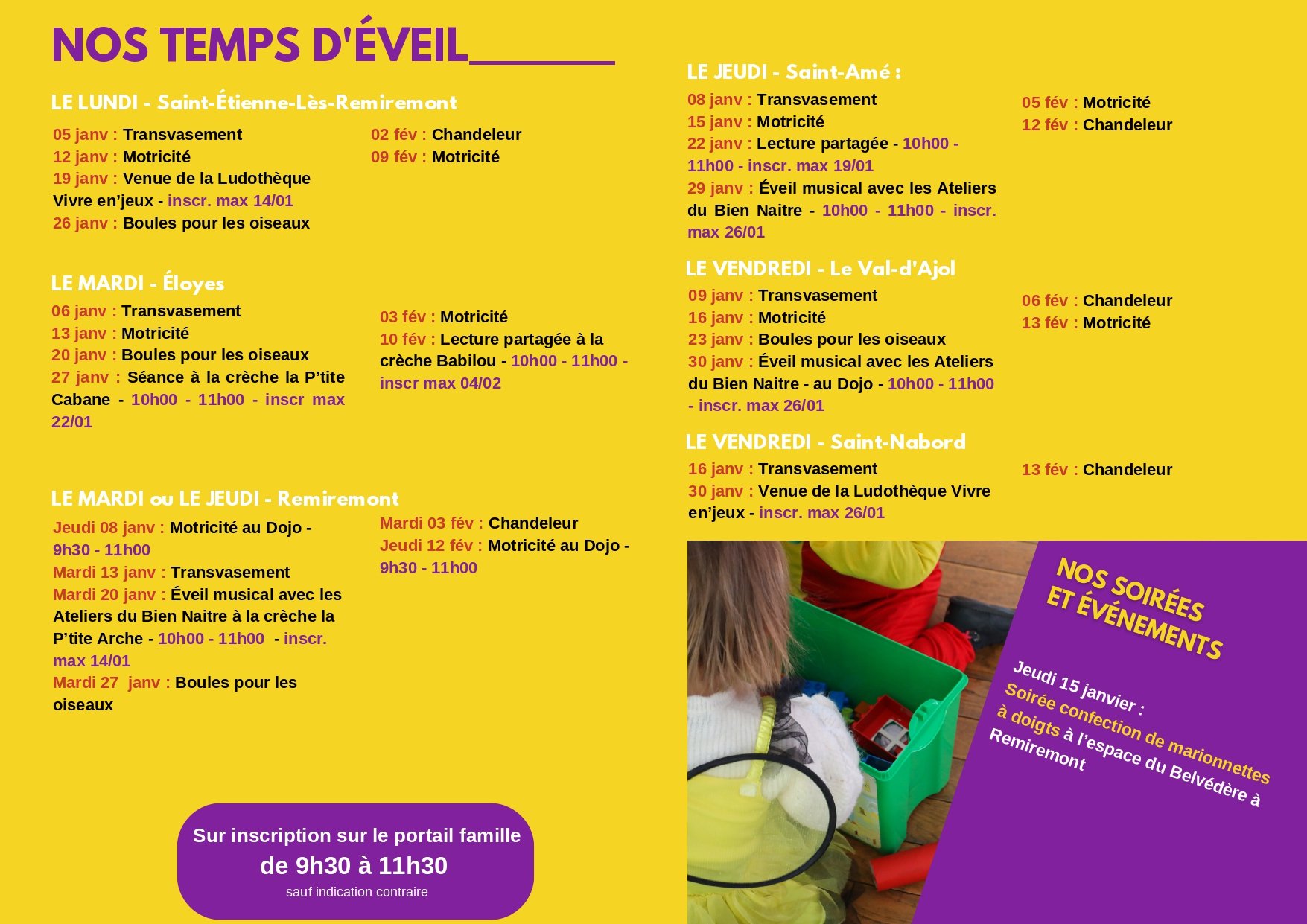 Vous trouverez ci-dessous le planning des ateliers d'éveil pour les mois de janvier et février 2026.