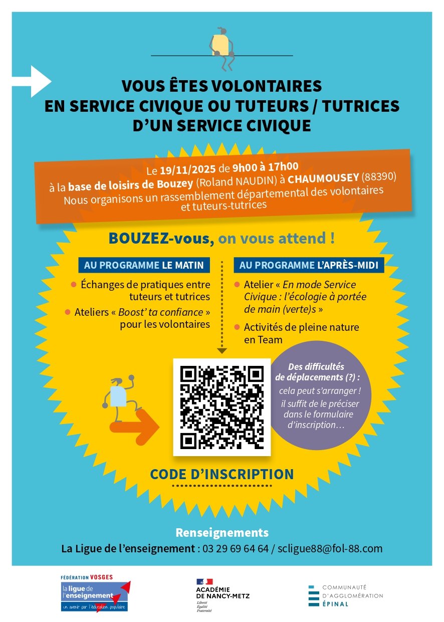 Le Service Départemental à la Jeunesse, à l'Engagement et aux Sports (SDJES) organise, en partenariat avec la Ligue de l'Enseignement des Vosges, un rassemblement départemental des volontaires engagés en mission de Service Civique et des tuteurs des organismes d'accueil agréés au titre de l'engagement de Service Civique.