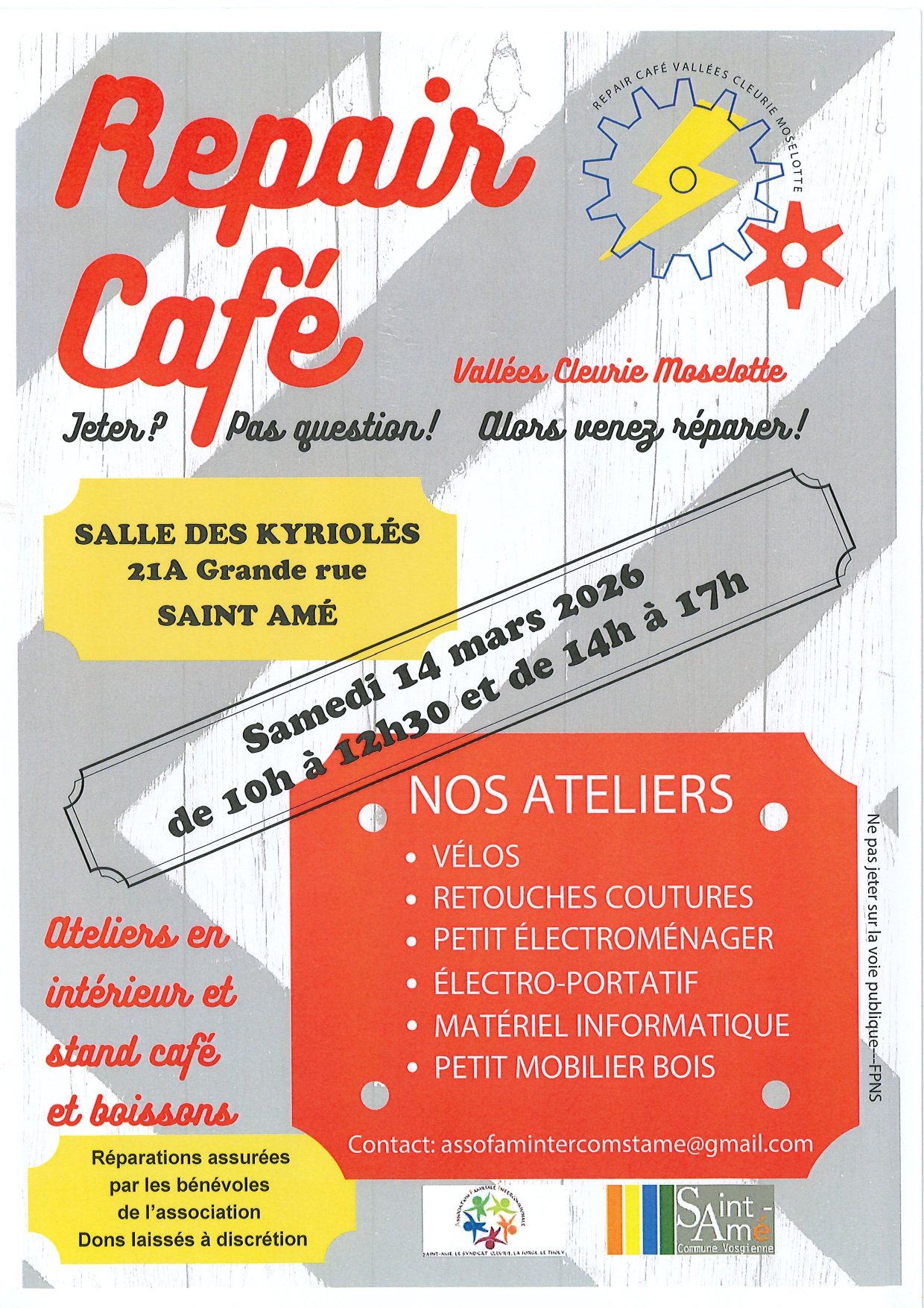 14 Mars 2026 10H - 17H - Salle Les Kyriolés JETER ! .... PAS QUESTION .... ALORS VENEZ RÉPARER au REPAIR CAFÉ Partager sur FacebookPartager sur TwitterPartager sur LinkedIn Retour à la liste des événementsSoumettre un événement Cliquez pour activer