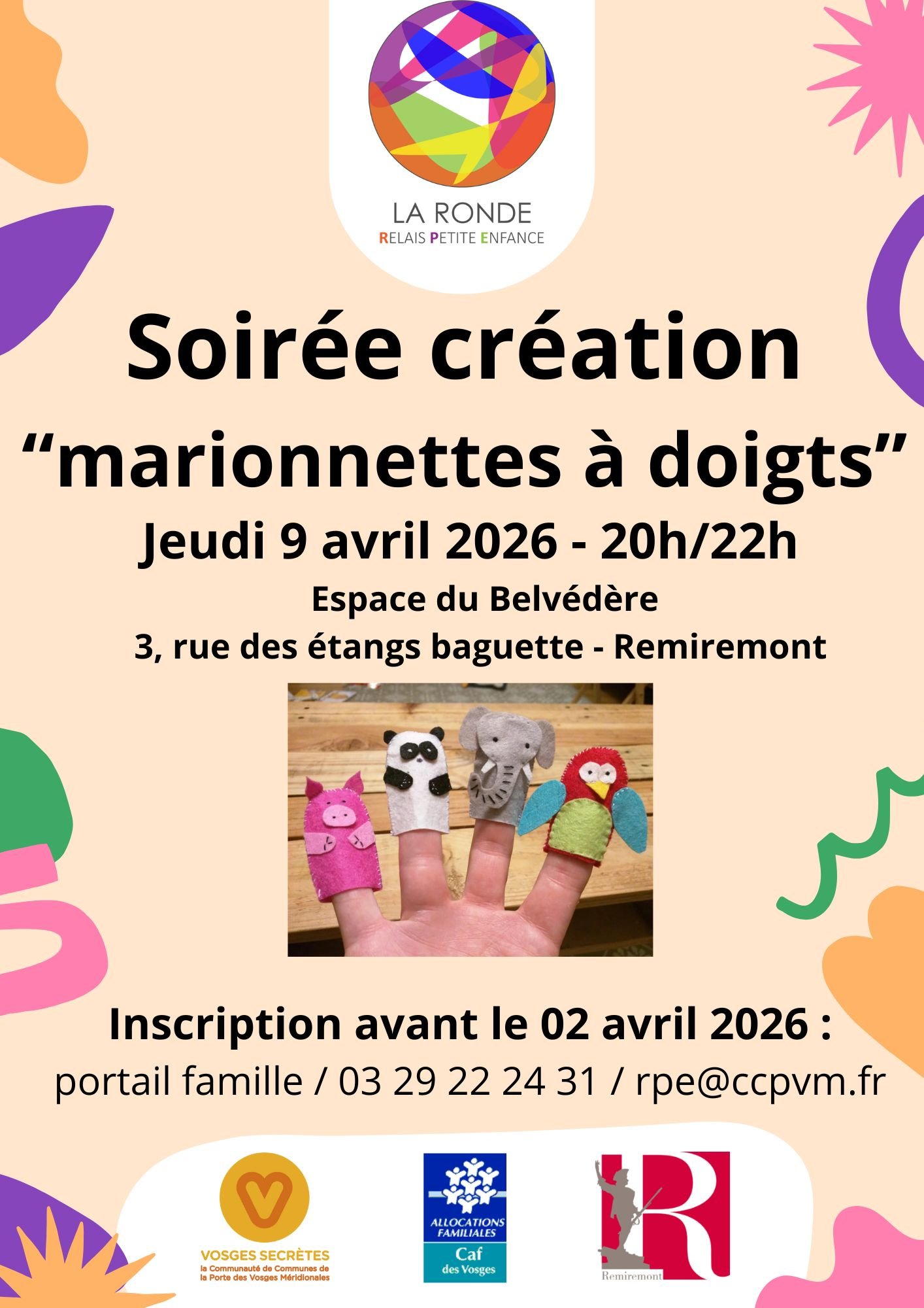 22 maimai 2025 Voir l'événement 20h à 22h - Espace du Belvédère Soirée création "marionnettes à doigts"